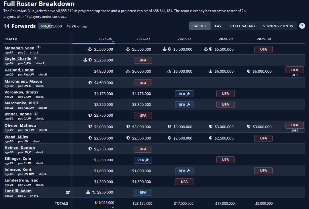 The cap is going up, and the corresponding hit being less and less painful each year, but signing up for more potential supoptimal cap-hit entering Adam Fantilli’s prime is a bit concerning. That he serves as insurance, and leverage, against the upcoming class of UFAs helps mitigate the damage it can do.