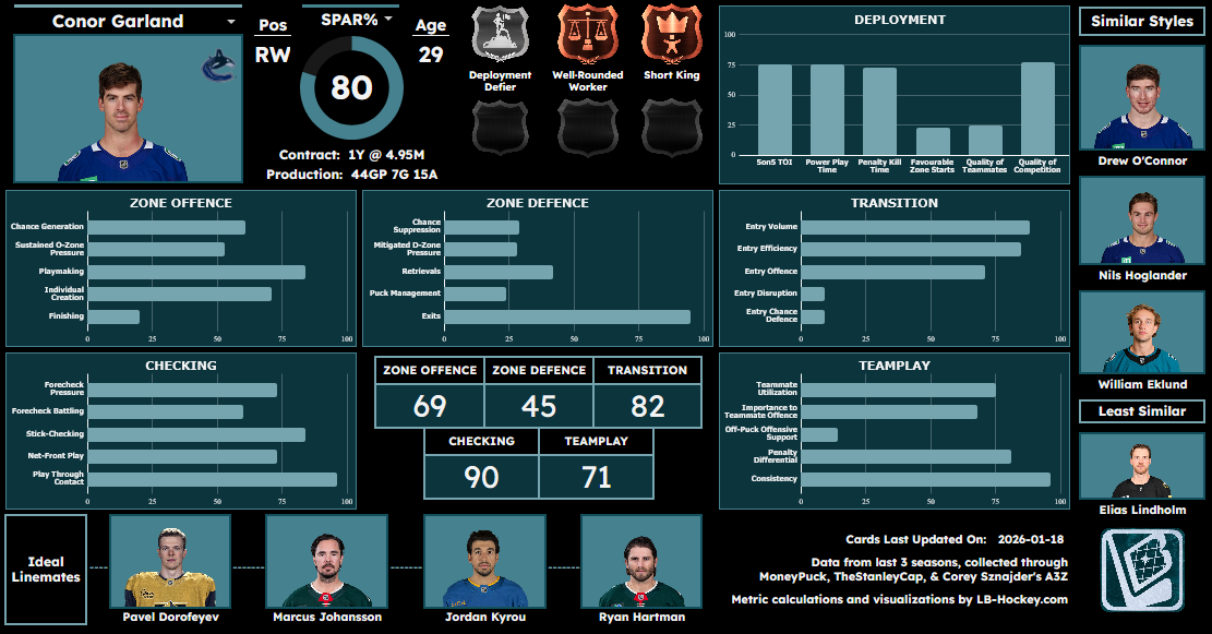 Though this sounds perfect to slot into the top six and alongside the talented finishers already there, Garland hasn’t necessarily played the nicest with this brand of players. His top seasons came on third lines and he was generally the guy on a line tasked with creating offense.