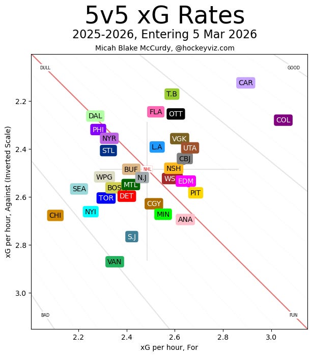 According to HockeyViz, which has one of the most well adjusted xG models, the Blue Jackets are, give or take, a top 10 5v5 team in terms of chance share (read as perpendicular distance from the red line).