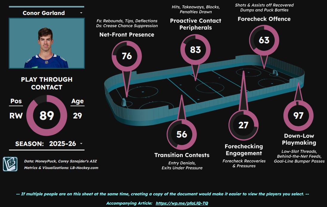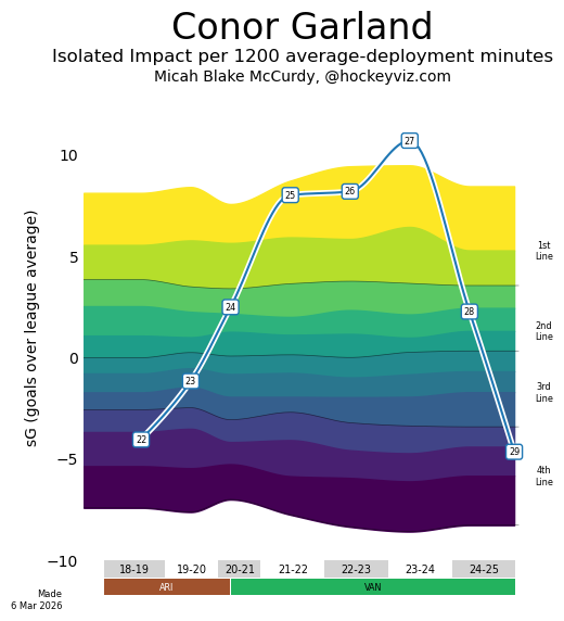 Every year, even though the last you have been down years from an adjusted impact perspective, Conor Garland grades out extremely well in LB-Hockey’s Play Through Contract metrics.