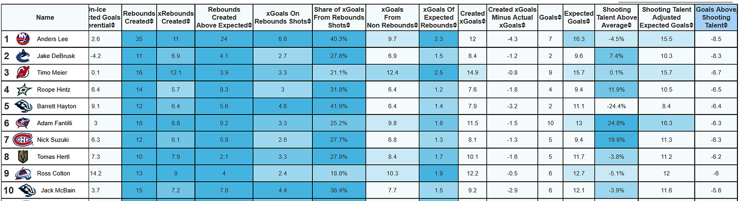 The above chart has been undermined a bit because of the most recent scoring surge but Fantilli is still under his “shooting talent adjusted” expected goals (the far right column). He is sixth worst in the league relative to his small-sample predicted shooting talent. More games like the above and there’s potential for a very big surge on the way to the playoffs.
