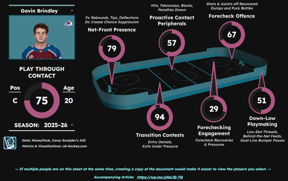 Hindsight is 2020 but I do find it curious that a tiny 30 year old with a 6 year extension was so preferred in place of the tiny Fantilli-partner we already had on the roster. Different players within this microstat view already, Brindley’s value is driven by tenacious neutral zone checking but competence elsewhere, but he’s also 20.