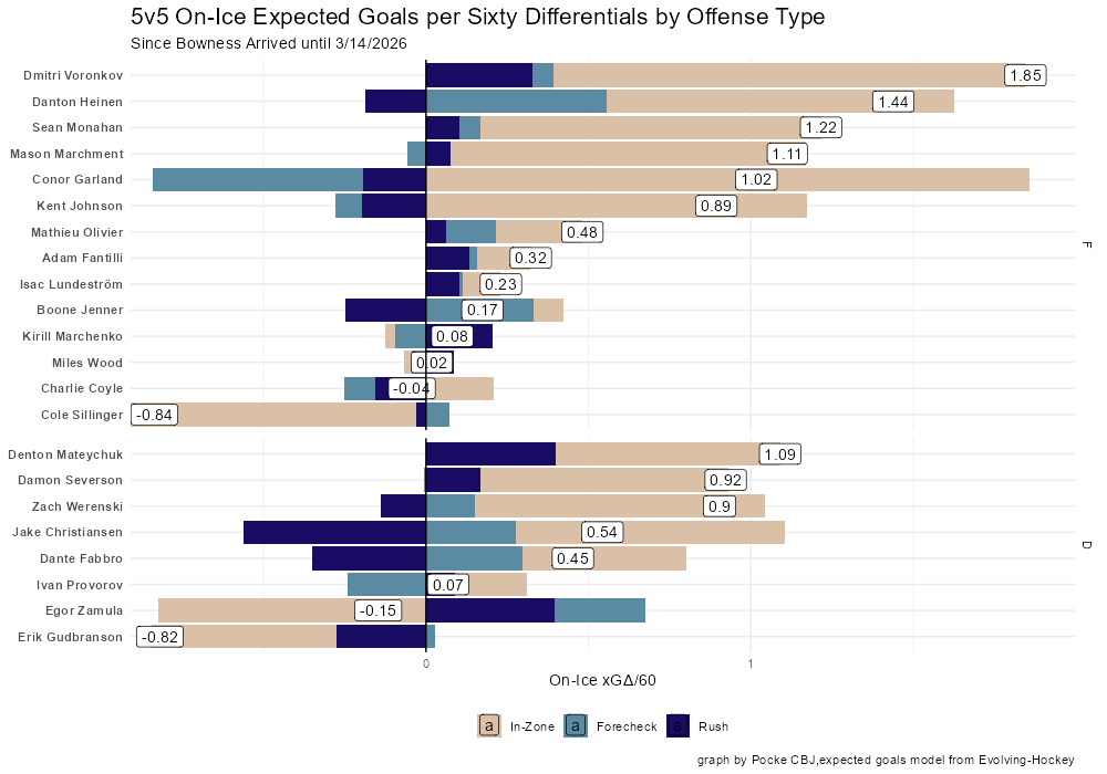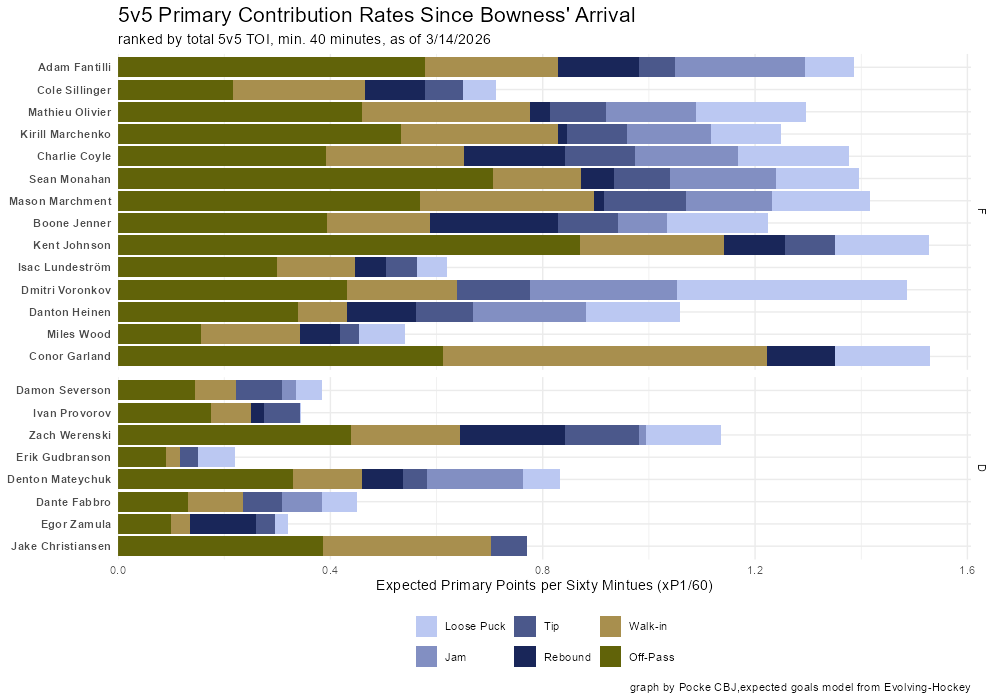 His offensive contributions, despite receiving the second most 5v5 icetime since Bowness’ arrival in January, have been putrid. Worse than we ever saw from Kent Johnson.