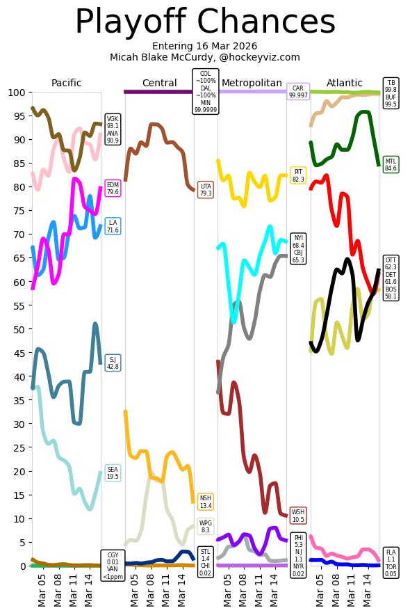 The Blue Jackets have taken few regulation losses in Bowness’ tenure behind the bench. As such, they continue to ascend up the playoff probability chart. Sometimes I think these sorts of things are useless in this use-case but it’s interesting enough to share.
